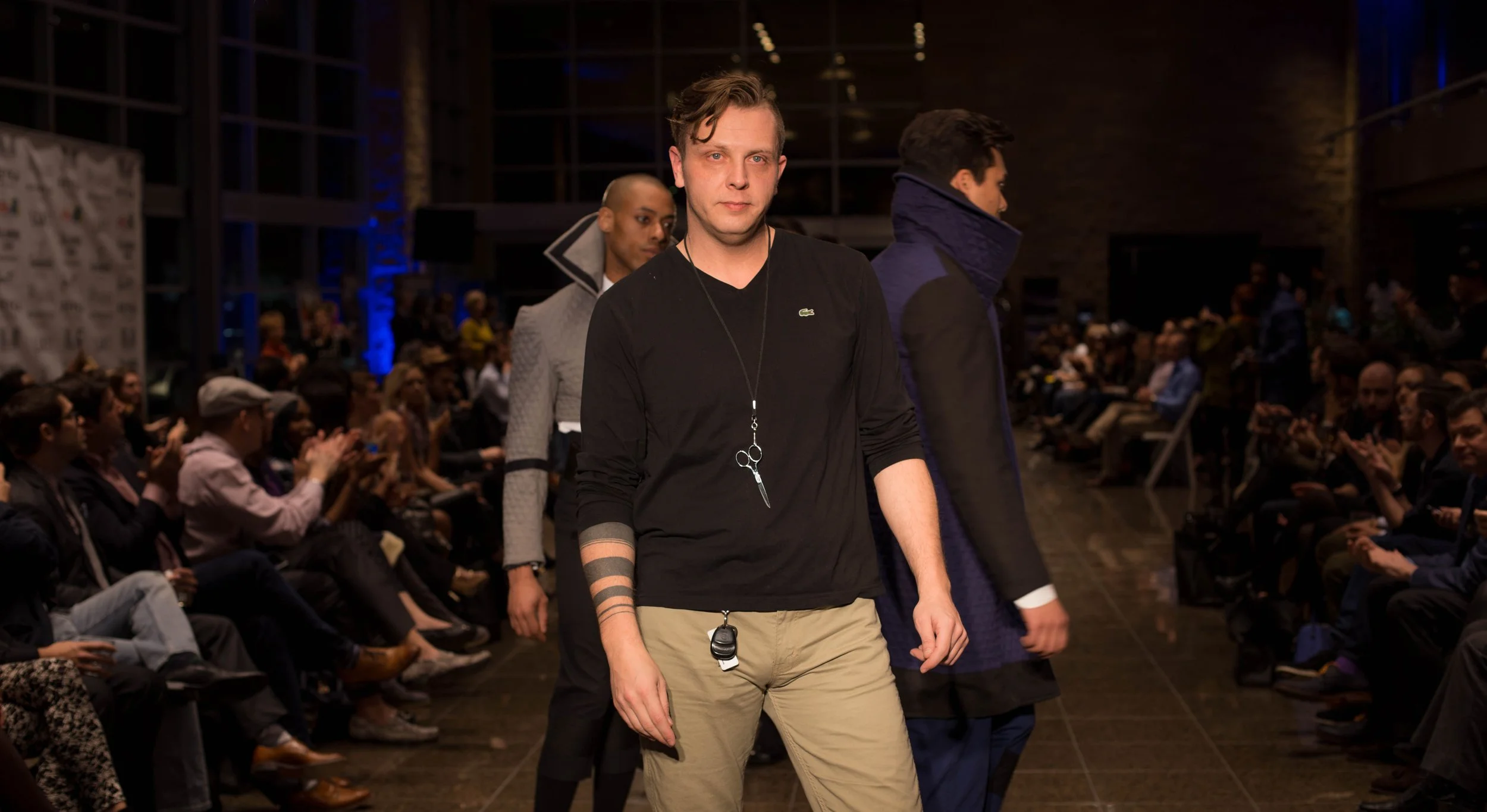 A man stands in front of a step and repeat backdrop with logos for Saint Louis Fashion Fund and Gant. He has a beard and is dressed casually in a blue button-up shirt, dark jeans, white sneakers, and a black jacket with a yellowish lining. He is also wearing a scarf around his neck.